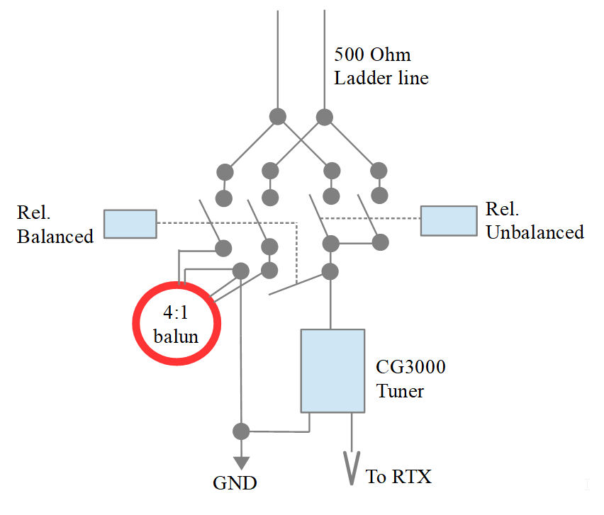 Initially, I considered using two separate tuners: a CG3000 automatic tuner for the vertical mode and an S-Match balanced tuner for the dipole. Then came the “stroke of genius”: What if I put a 4:1 balun at the output of the CG3000?